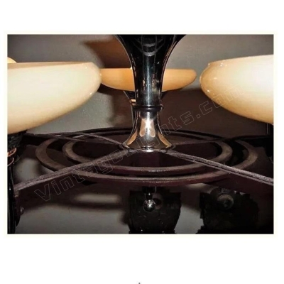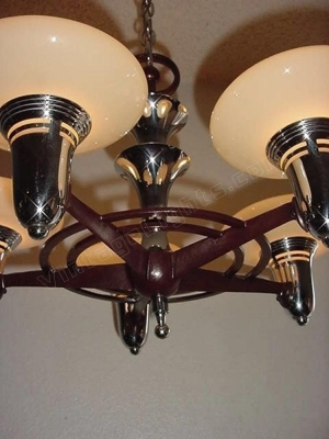 2 matching available. Sourced from the 1930s is this chrome and custard glass Mid Century style 5 light antique fixture with original vintage custard shades. Original burgundy color repainted on arms and ball. Manufactured by Lightolier. Rewired to UL standards with mounting hardware included Drop as shown: 27 inches (can be adjusted) Width: 20 1/2 inches.