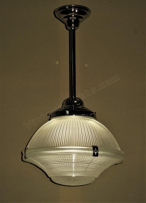 Several available, all in excellent condition. From a Catholic church gymnasium in Wisconsin. These are the largest we have seen in this 3 piece variety at 14 inches across. The two 1/2 spheres are held together with 4 metal clips (original) and the original bottom lens is on each. The removable bottom lens is 6 1/4" across and designed to be easily removed to access changing the bulb. This original bottom lens is often missing, but not on these. Holophane shades are known for their incredible clarity and shine. They sparkle when lit like no other, probably one reason Holophane is still in business today. They have patented prismatic ribs all along the inside and outside which softens and diffuses the harsh light produced by light bulbs, causing the refracted light to be pleasing to the eye. There are also bands of wavy rings on the inside upper third of each shade. Holophane was the industry leader on light refracting technology and each rib of glass is precisely place to disperse the light in exactly the manner wanted. These came out of their gym and can handle up to 250 watts each. The shade itself is only is 10 inches high. Perfect for today's modern kitchens or baths. Shown on a new nickel pole fitter. We have a couple of options for mounting the shades including pole or chain hung in Nickel. No additional charge for any option up to a 24 inch drop. Rewired to UL standards and comes with a heavy duty mounting bracket (except the original flush mount fitter).