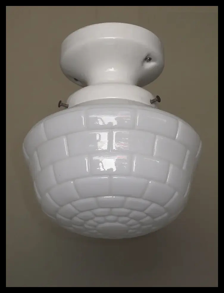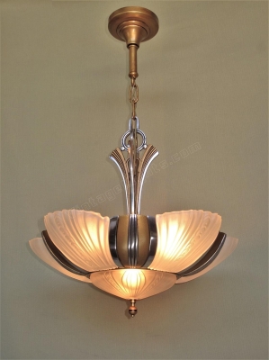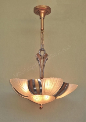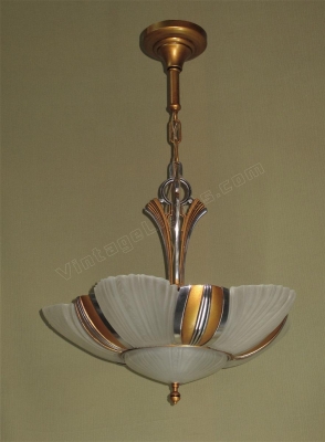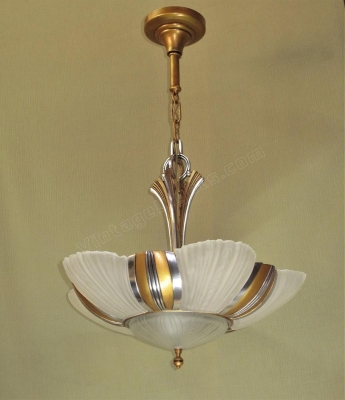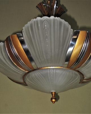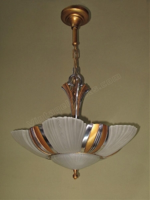 Two matching 7 light bulb 1930s Art Deco ceiling fixtures, priced each. Restored to original colors including highly polished aluminum accents (NOT painted) and a warm antique golden body color. There two sockets lighting the bottom shade along with five sockets around the outside. Rewired with new UL listed sockets and wiring. Rewired to UL standards. All five slip shades and the bottom shade are all in excellent condition with no chips and no noticeable chips. Drop as shown is 28 inches. The drop can be adjusted to meet your needs.