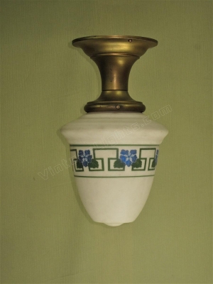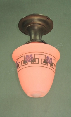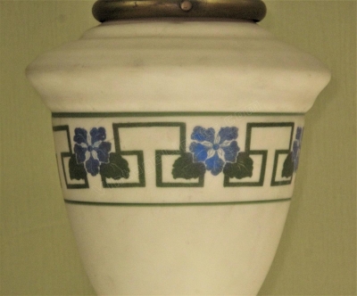 Very nice ceiling fixture with a green and blue stenciled band with Greek Key, leaves and very detailed blue flowers. The glass is a matte bisque color, as I would describe as an off white with a slight light tan color. Great for a bungalow, craftsman, or arts & crafts interior. Kitchen nook, mud room, or Inglenook. Glass in excellent condition with no noticeable chips and no cracks. The colors in the design are still very strong showing little signs of wear or fading, as you can see in the close up. Globe shown a vintage very elegant long throat semi-flush fitter. Drop as shown is 13 inches. Width at globe is 8 inches.